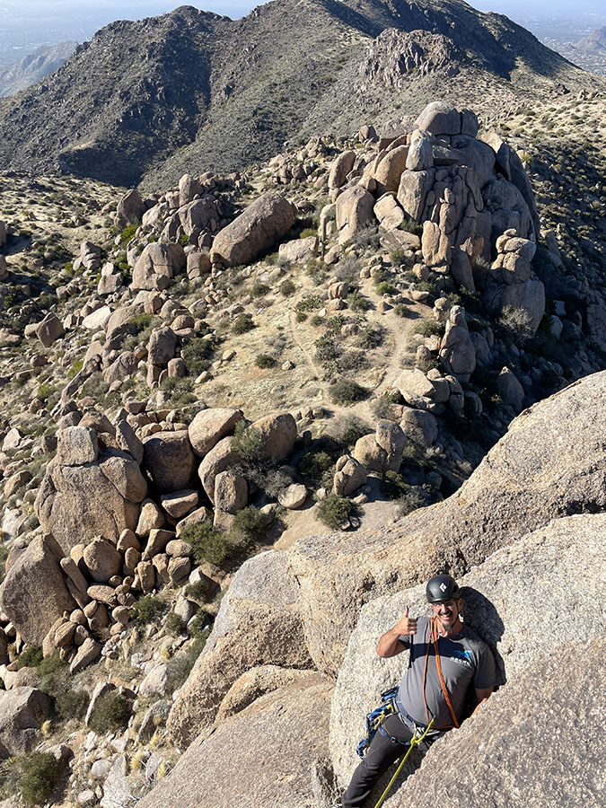 The cooler months in the Sonoran Desert provide the perfect climate to take in the views of the city from the top of this prominent feature. The approach and descent can feel a more strenuous than the crags closer to the parking lot, but well worth it!